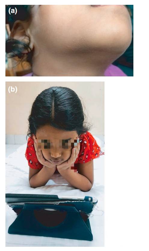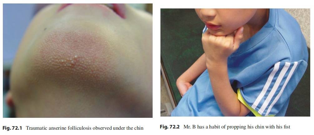 图注:(a) 颌部簇集的毛囊性丘疹;(b) 患儿在观看平板电脑时,将下巴托在手掌上。