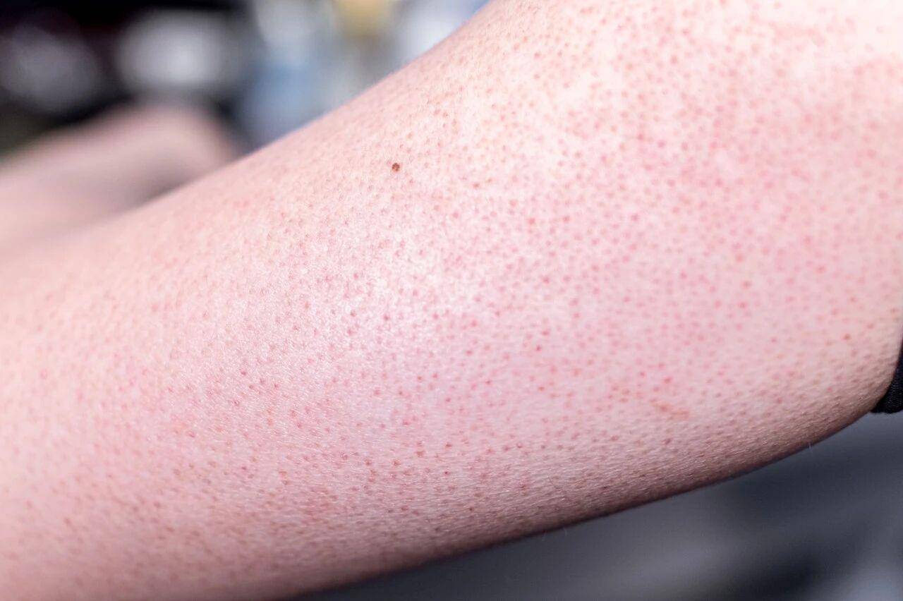 这是一种常见的遗传性皮肤病,本质是毛囊口被角栓堵塞。它最常对称性地分布于双上肢外侧、大腿和面颊外侧区域也可发生。