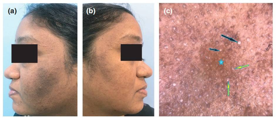 图注:(a) 左颊可见伴有色素沉着的毛囊性丘疹;(b) 右颊相对未受累;(c) 左颊皮肤镜检查。