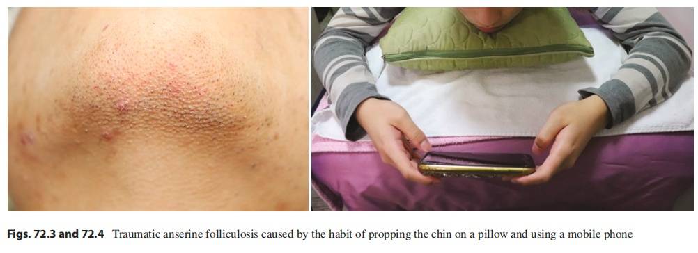 一组研究显示,五名孩子因为长时间趴在床上用手支撑下巴看智能手机或平板电脑,导致下颌和脸颊出现了创伤性鹅皮样毛囊病。