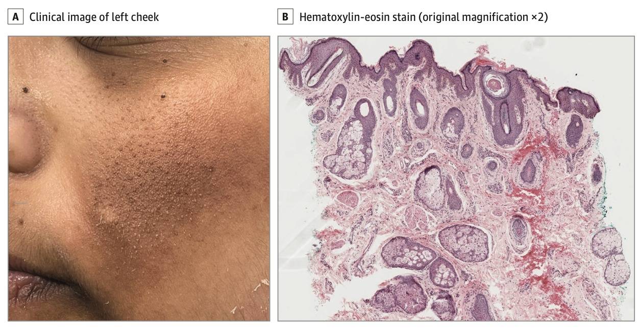 医生检查时发现,她左侧脸颊上有一片4x3.5厘米大小的区域,布满了密密麻麻的肤色小丘疹,而这些小丘疹的背景肤色明显加深(色素沉着)。